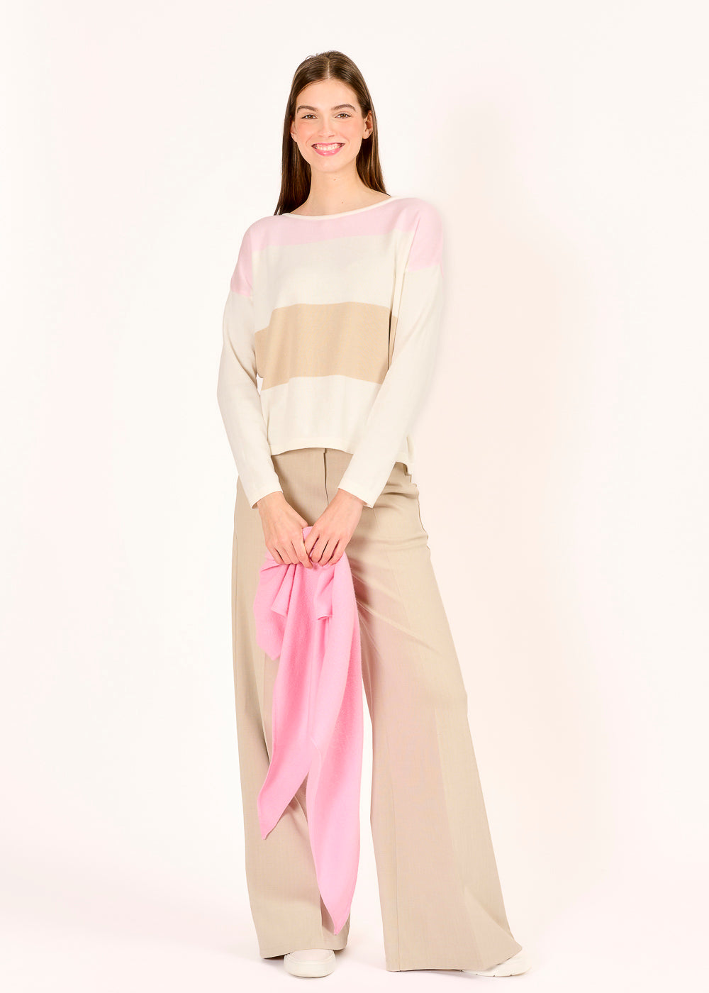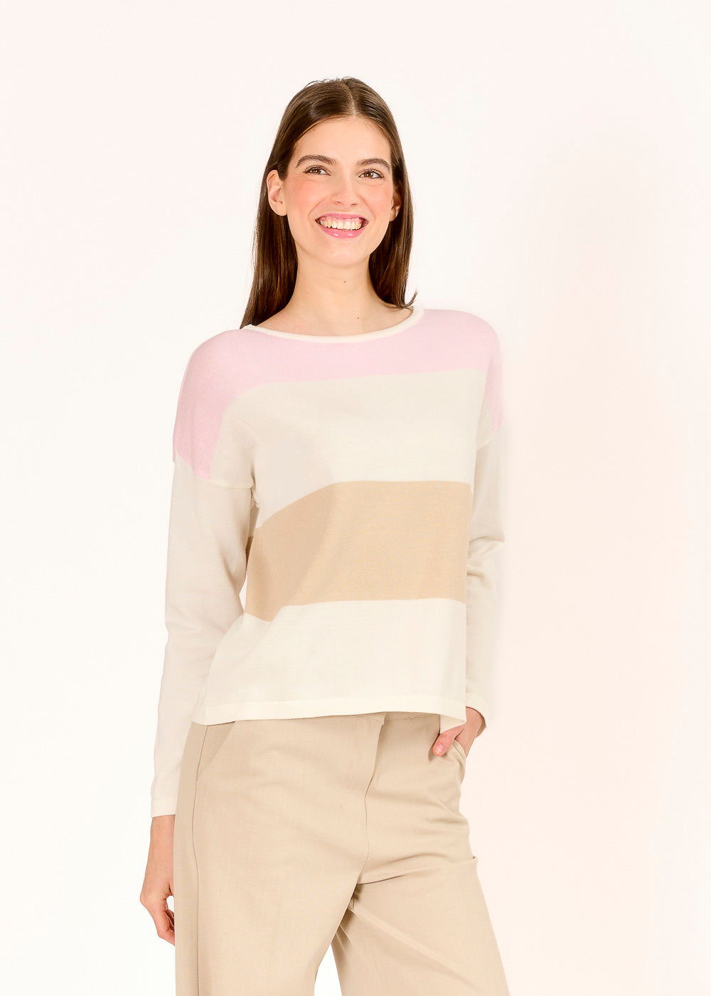 Unser dreifarbiger Pullover in den sanften Nuancen von Beige, Weiß und Rosa vereint Stil und Gemütlichkeit auf harmonische Weise. Diese besondere Mischung der Farbtöne erzeugt eine feminine Ausstrahlung, während das schlichte Design des Pullovers ihn zu einem vielseitigen Kleidungsstück für unterschiedliche Anlässe macht.