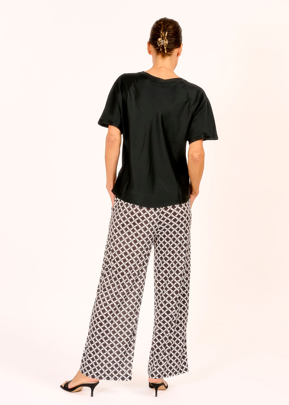 Dieses Satin Shirt in klassischem Schwarz vereint lässigen Chic mit eleganter Ausstrahlung. Der fließende Stoff verleiht dem Shirt eine edle Note und sorgt für ein angenehmes Tragegefühl. Ob zu Jeans oder zum schicken Rock – dieses Oberteil passt sich jedem Look stilvoll an.