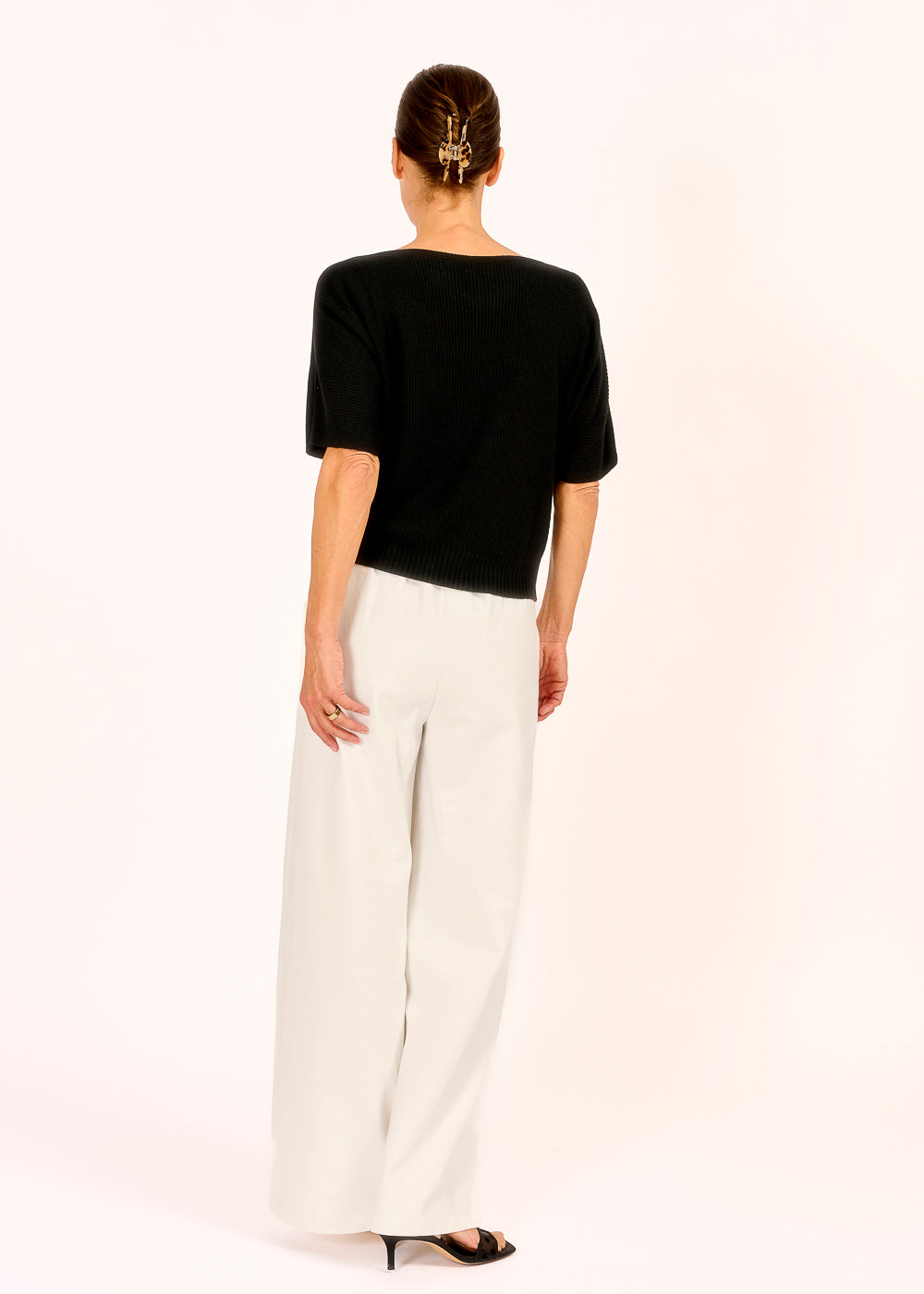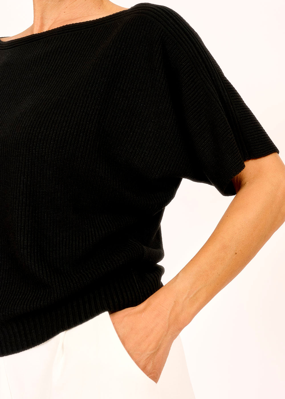Dieser lässige Fledermauspullover in Schwarz überzeugt durch seinen runden Ausschnitt und die weiche Viskosequalität, die für einen angenehmen Tragekomfort sorgt. Die aufwendige Stricktechnik verleiht dem Pullover eine besondere Struktur und sorgt für einen eleganten, aber entspannten Look.