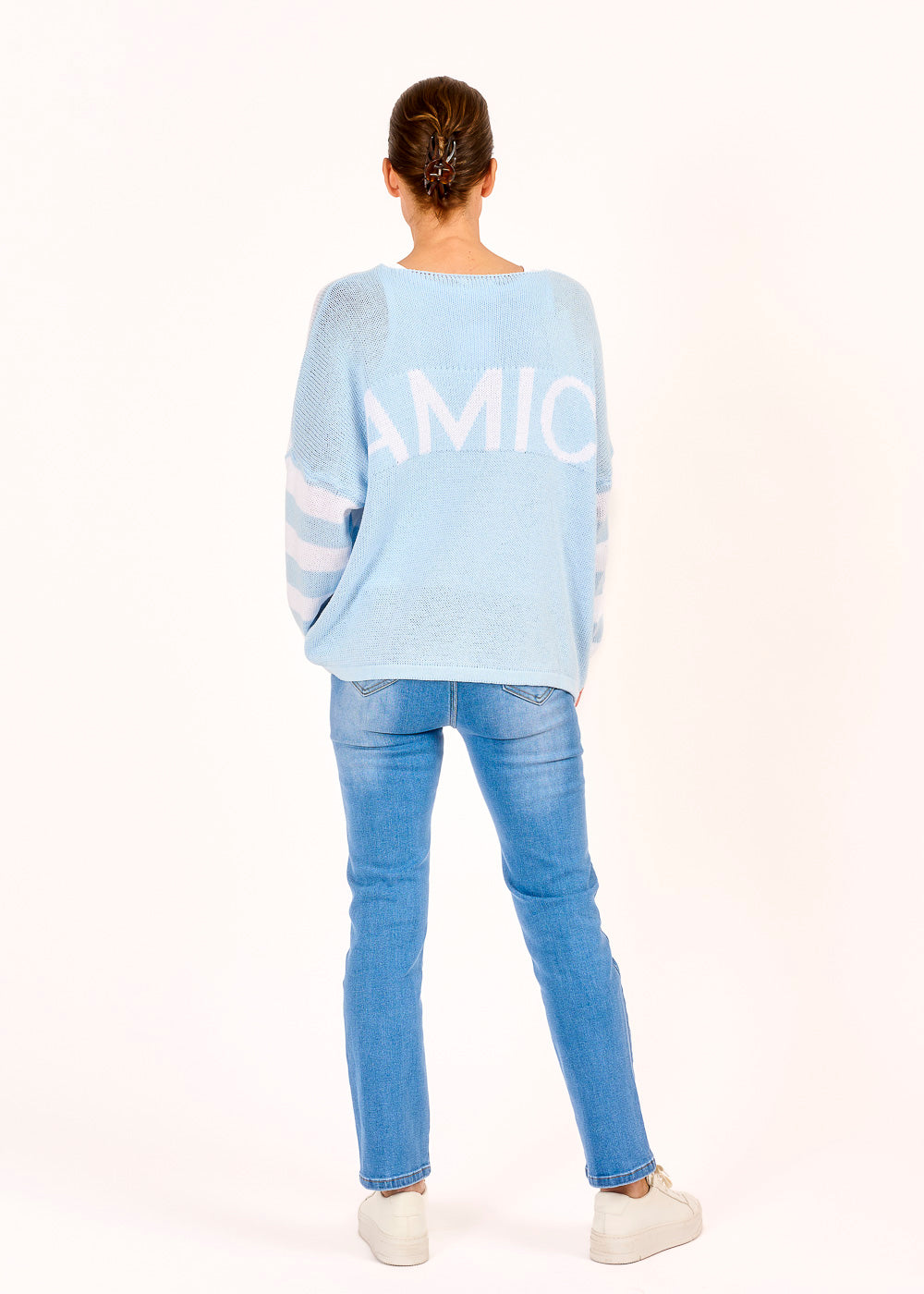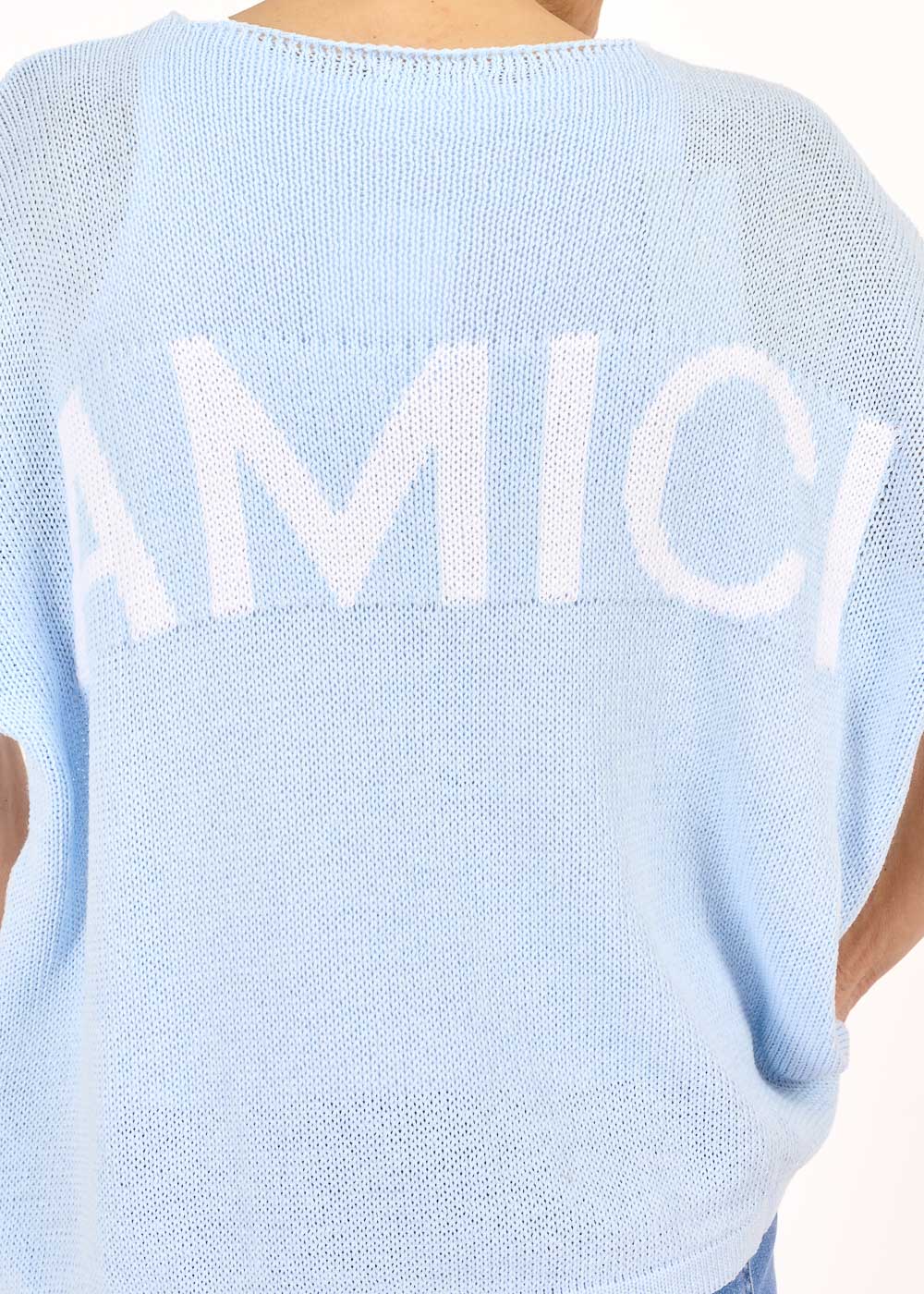 Dieser Pullover aus leichtem Sommer-Baumwollgarn zeigt sich in frischem Blau und punktet mit einem entspannten Stil sowie einem besonderen Detail auf der Rückseite: dem eingestrickten Schriftzug „Amici“. Die feine Intarsien-Stricktechnik verleiht ihm eine hochwertige Verarbeitung und einen individuellen Charakter. Angenehm zu tragen, ist er der ideale Begleiter für entspannte Sommertage.
