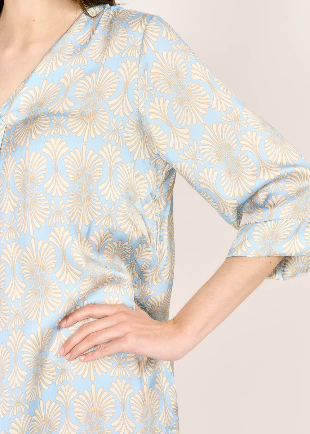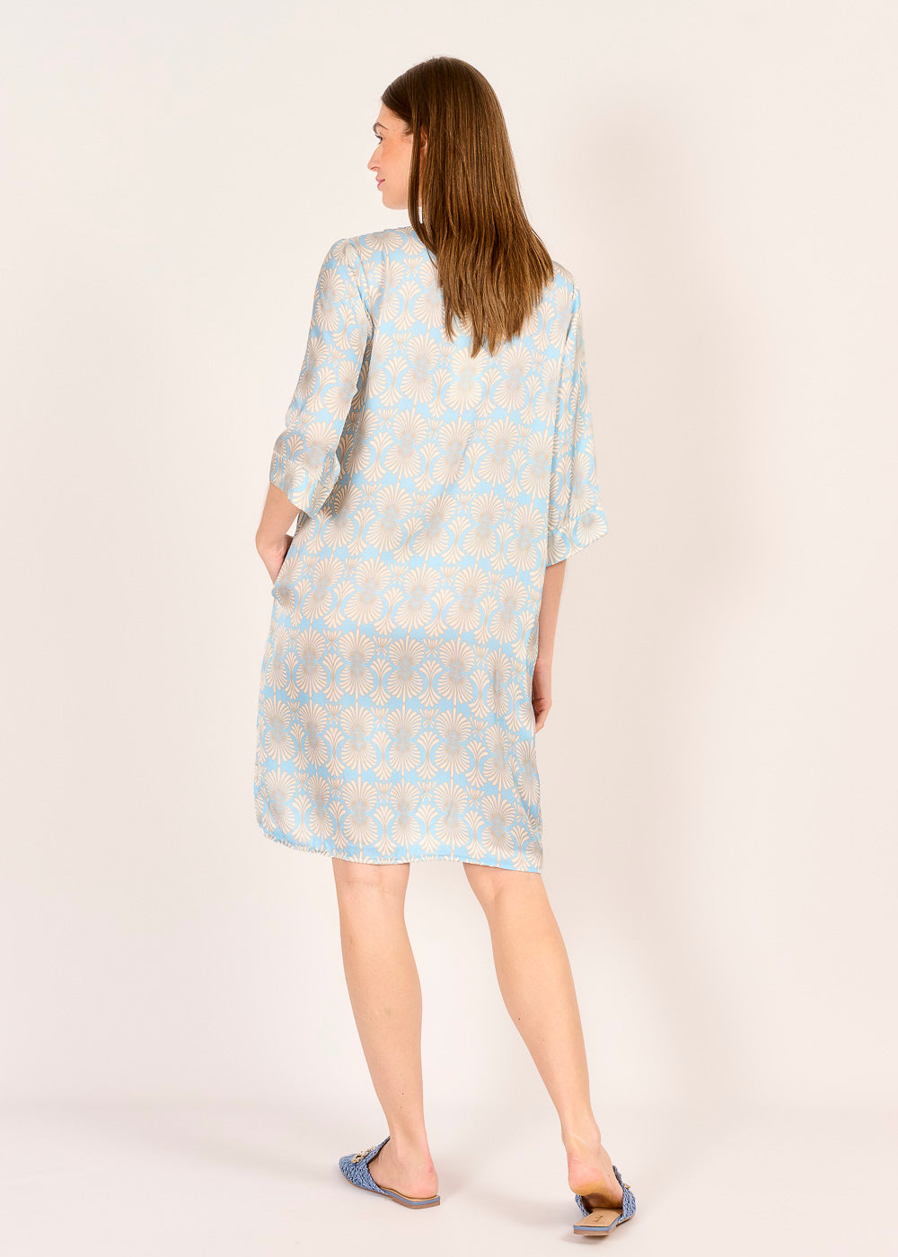 Dieses Druckkleid in Blau-Beige überzeugt mit seinem luftigen Schnitt und dem hochwertigen Stoff aus 100 % Viskose – angenehm weich und perfekt für warme Tage. Die 3/4-Ärmel und seitlichen Eingriffstaschen verleihen dem Kleid eine entspannte Lässigkeit. Ob mit Sneakern oder Sandalen – ein unkomplizierter Look mit Stil.