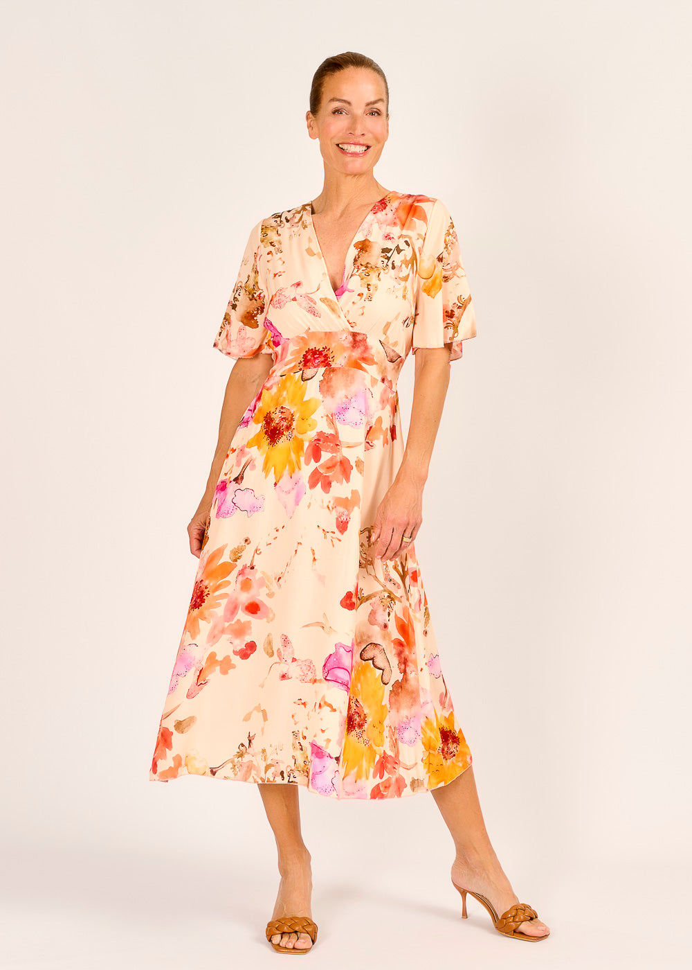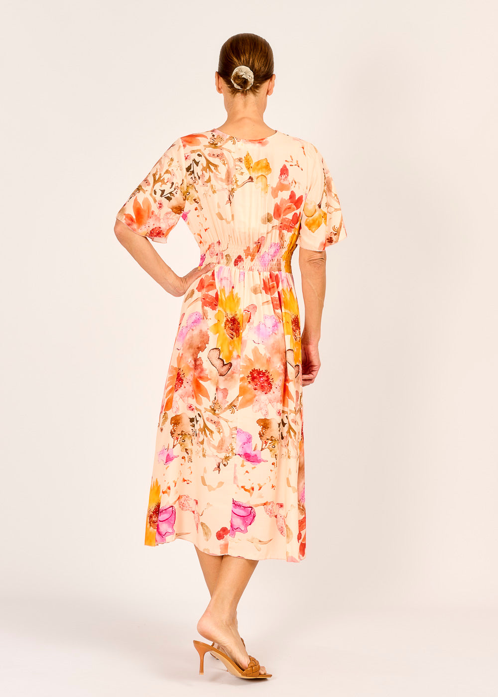 Dieses sommerliche Kleid begeistert mit seinem lebendigen Muster in Apricot-Orange und großflächigen Blumenmotiven in zarter Aquarell-Optik. Der elastische Einsatz am Rücken sorgt für eine perfekte Passform und hohen Tragekomfort. Luftig, farbenfroh und stilvoll – ein echtes Lieblingsstück für sonnige Tage!