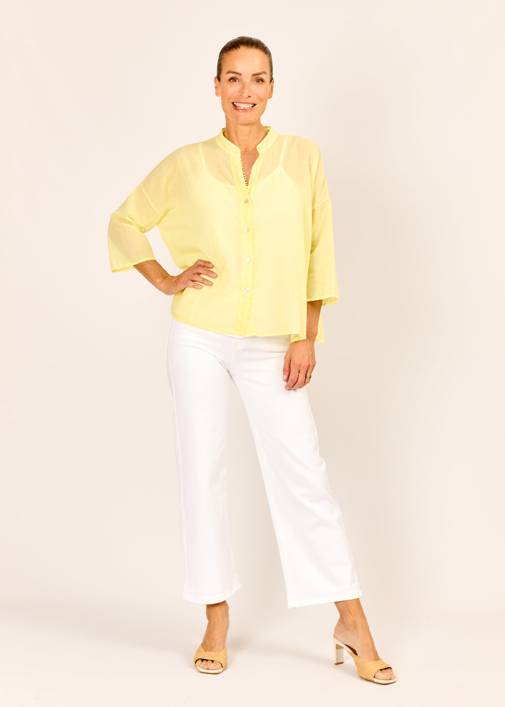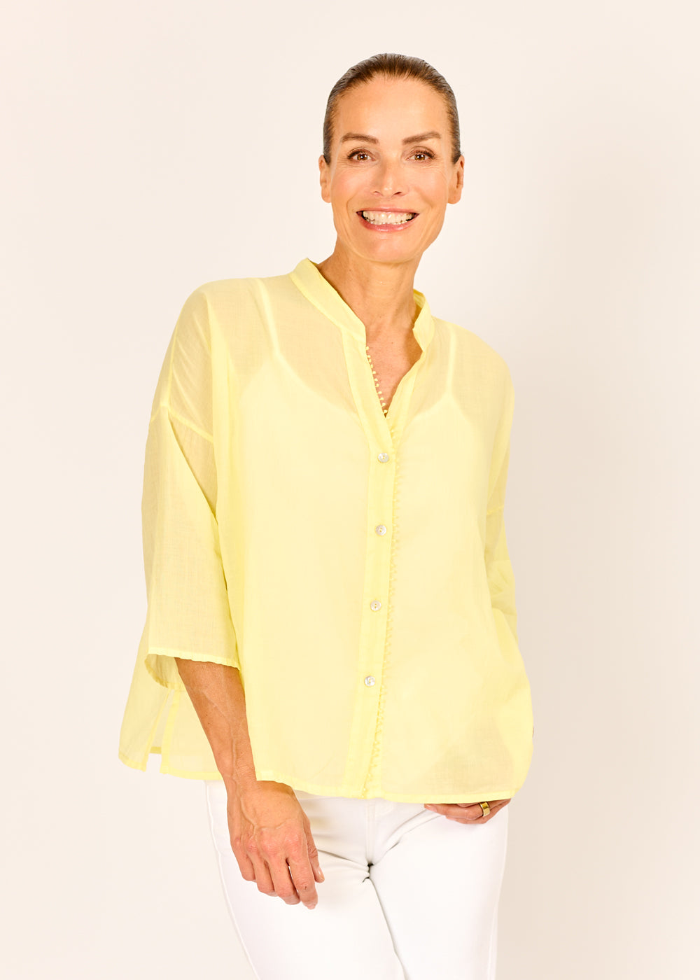 Hauche deinem Look mit dieser wunderschönen Batist-Tunika in zartem Giallino neues Leben ein. Das leichte, durchscheinende Material umschmeichelt die Figur und sorgt für ein luftig-leichtes Tragegefühl, perfekt für warme Tage. Mit ihrem edlen Stehkragen und den dezenten Knöpfen ist sie ein vielseitiges Key-Piece, das Eleganz und lässige Leichtigkeit spielend vereint.
