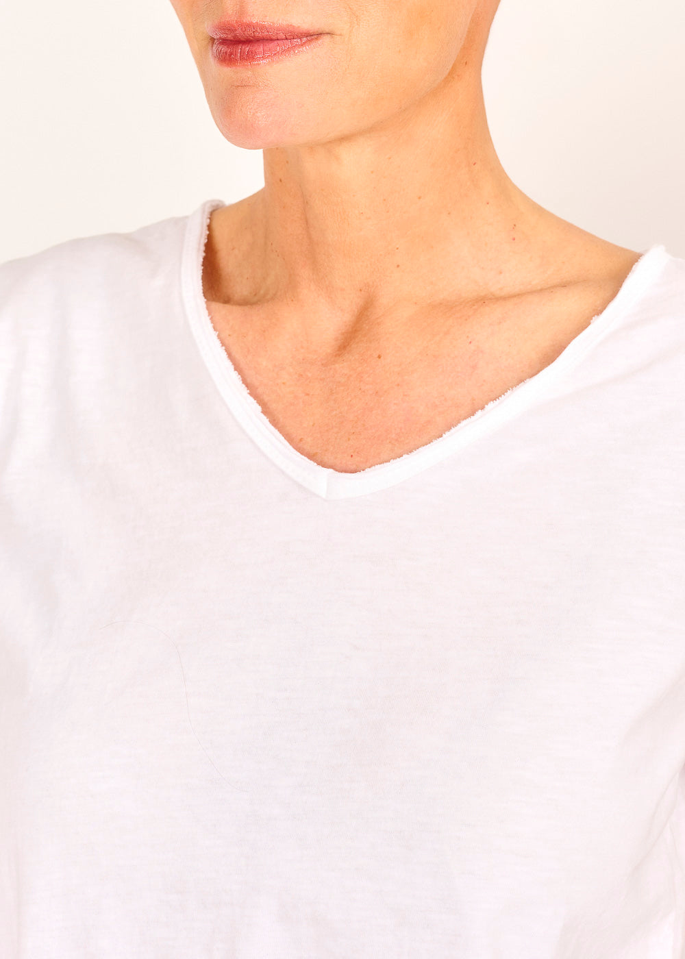 Dieses weiße Shirt mit kurzen Ärmeln und V-Ausschnitt ist ein echtes Basic-Essential für jede Garderobe. Der feminine Ausschnitt unterstreicht dezent die Silhouette, während das weiche Material für ein angenehmes Tragegefühl sorgt. Ob casual oder elegant gestylt – dieses vielseitige Shirt passt zu jedem Anlass.