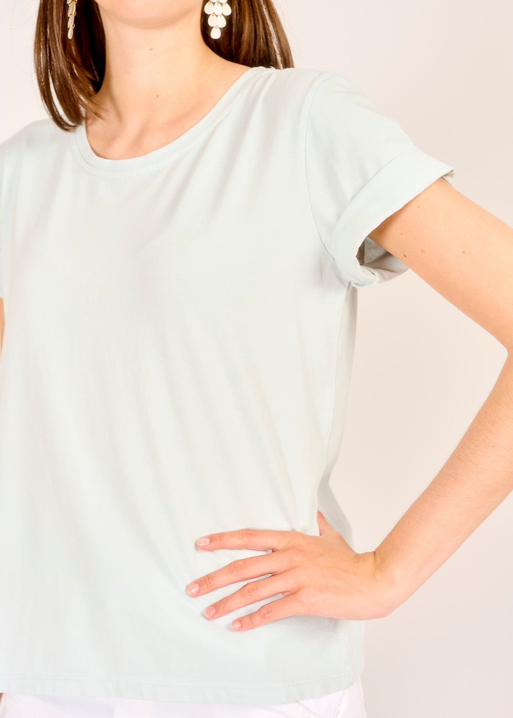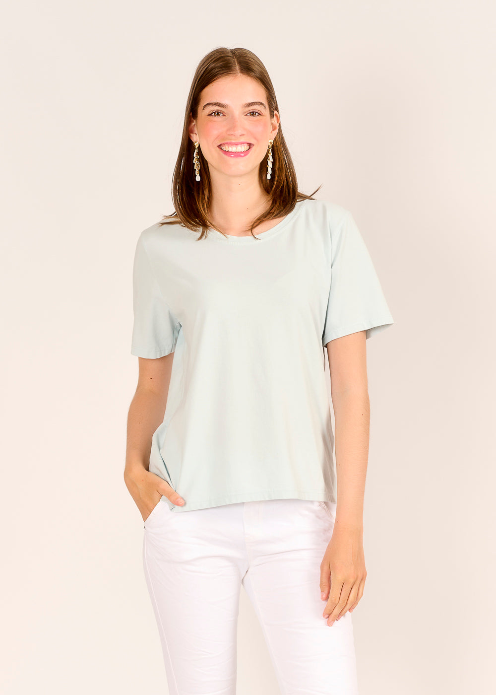 Frischer Wind für deine Garderobe: Dieses T-Shirt in zartem Celeste bringt Leichtigkeit und Stil in jeden Look. Der gerade Schnitt und der weiche Stoff sorgen für ein angenehmes Tragegefühl – perfekt für entspannte Alltagsmomente. Ob zur Jeans, zum Rock oder unter einem Blazer – dieses Shirt ist ein echtes Kombi-Talent mit sommerlichem Flair.