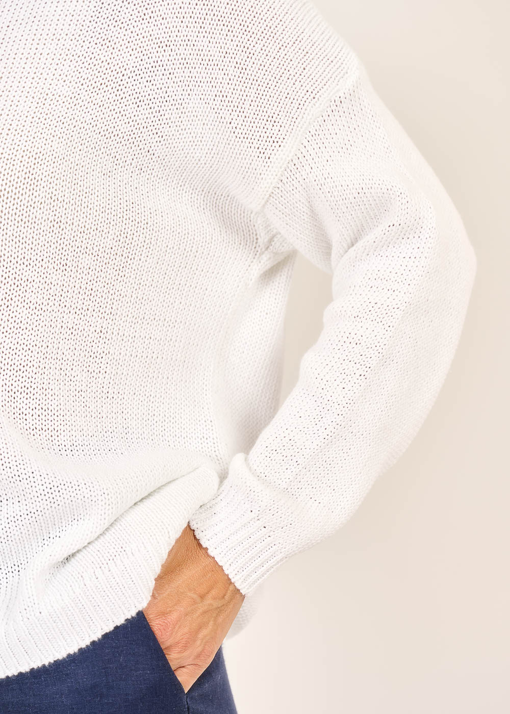 Dieser leichte Strickpullover in strahlendem Weiß ist ein zeitloses Essential, das Eleganz und Komfort vereint. Der weite, runde Saum und der U-Boot-Ausschnitt sorgen für eine entspannte Passform und eine schmeichelhafte Silhouette. Perfekt für kühle Sommerabende oder als stilvoller Layering-Partner.