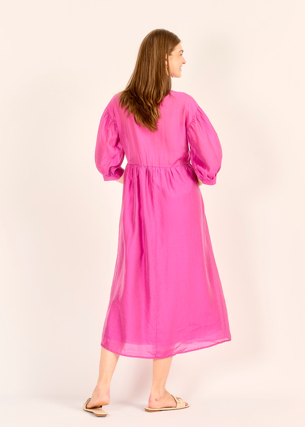 Luftig, lässig, unwiderstehlich – dieses Sommerkleid in leuchtendem Fuchsia bringt Boho-Vibes in Reinform in deinen Kleiderschrank. Der weite Schnitt aus weichem Lyocell umspielt deine Silhouette wie eine Sommerbrise und sorgt für maximalen Komfort an heißen Tagen. Ein echtes Fashion-Highlight für alle, die das Besondere lieben – unkompliziert, feminin und voller Lebensfreude.