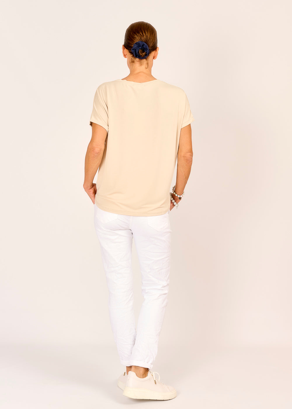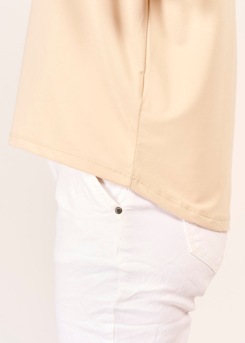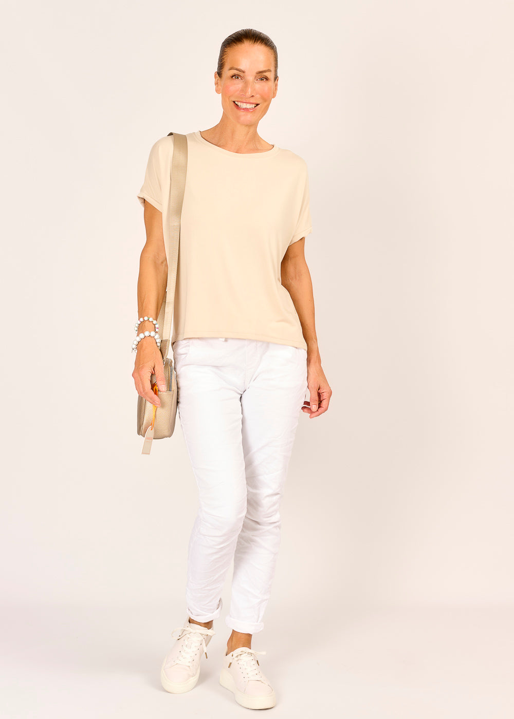 Dieses traumhaft weiche Viskoseshirt in edlem Beige ist ein wahrer Hautschmeichler und die perfekte Basis für unzählige Looks. Der runde Ausschnitt und die zarte Qualität umspielen Ihre Figur sanft und bieten höchsten Tragekomfort den ganzen Tag über. Ob elegant unter einem Blazer oder lässig zur Jeans – dieses Shirt verleiht jedem Outfit eine mühelose Eleganz.