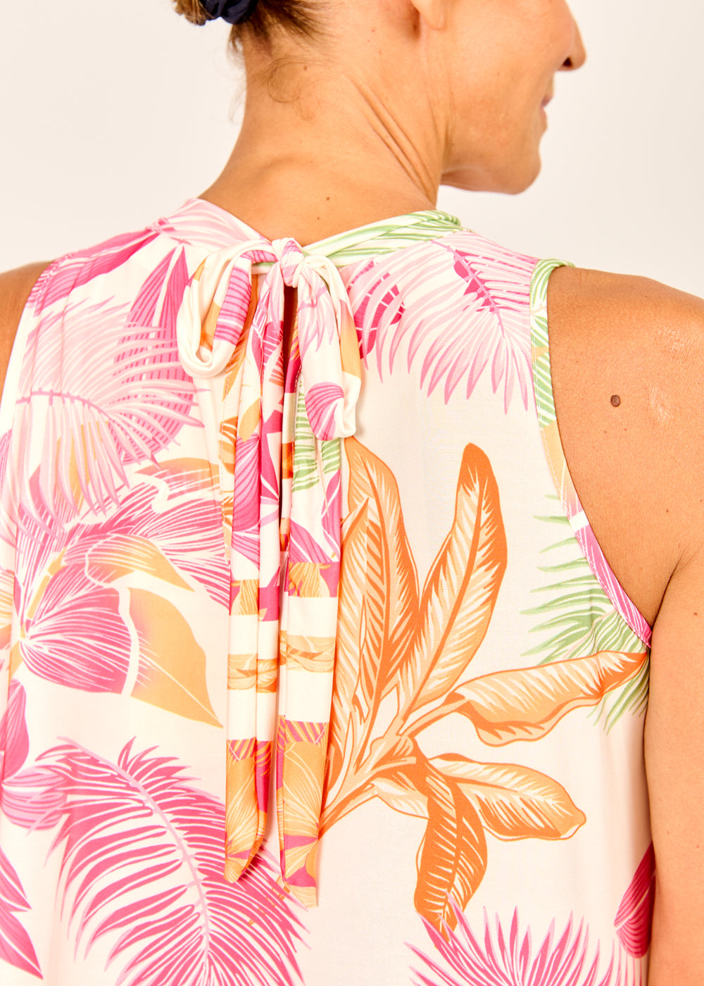 Entdecken Sie das perfekte Sommerkleid: Dieses kurz geschnittene Neckholderkleid mit seinen tropischen Blattmustern in Pink, Orange und Grün fängt die Leichtigkeit warmer Tage ein. Der elegante Neckholder-Schnitt betont die Schultern, während der lockere Fall des Kleides unbeschwerte Bewegungsfreiheit verspricht. Ideal für Strandtage, Gartenpartys oder einfach, um sommerliche Lebensfreude auszustrahlen.