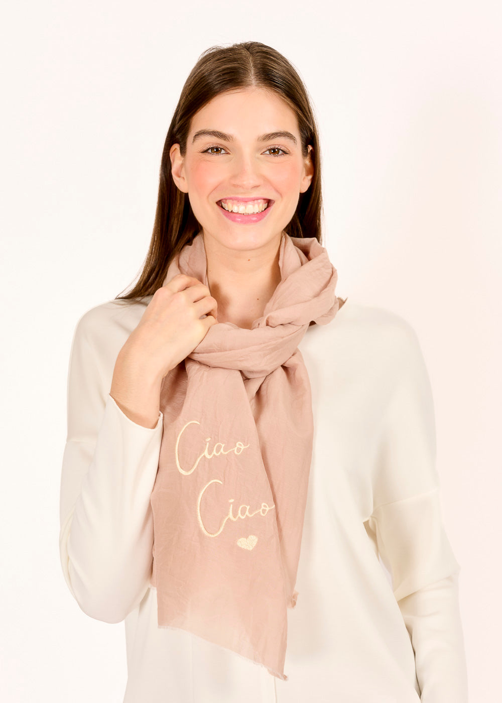 Dieses Tuch mit der liebevollen Stickerei "Ciao Ciao" ist ein charmantes Accessoire mit italienischem Flair. Der leichte Stoff und das verspielte Detail machen es zum perfekten Begleiter für frische, modische Looks. Ideal für deinen nächsten Stadtbummel oder einen entspannten Café-Besuch.
