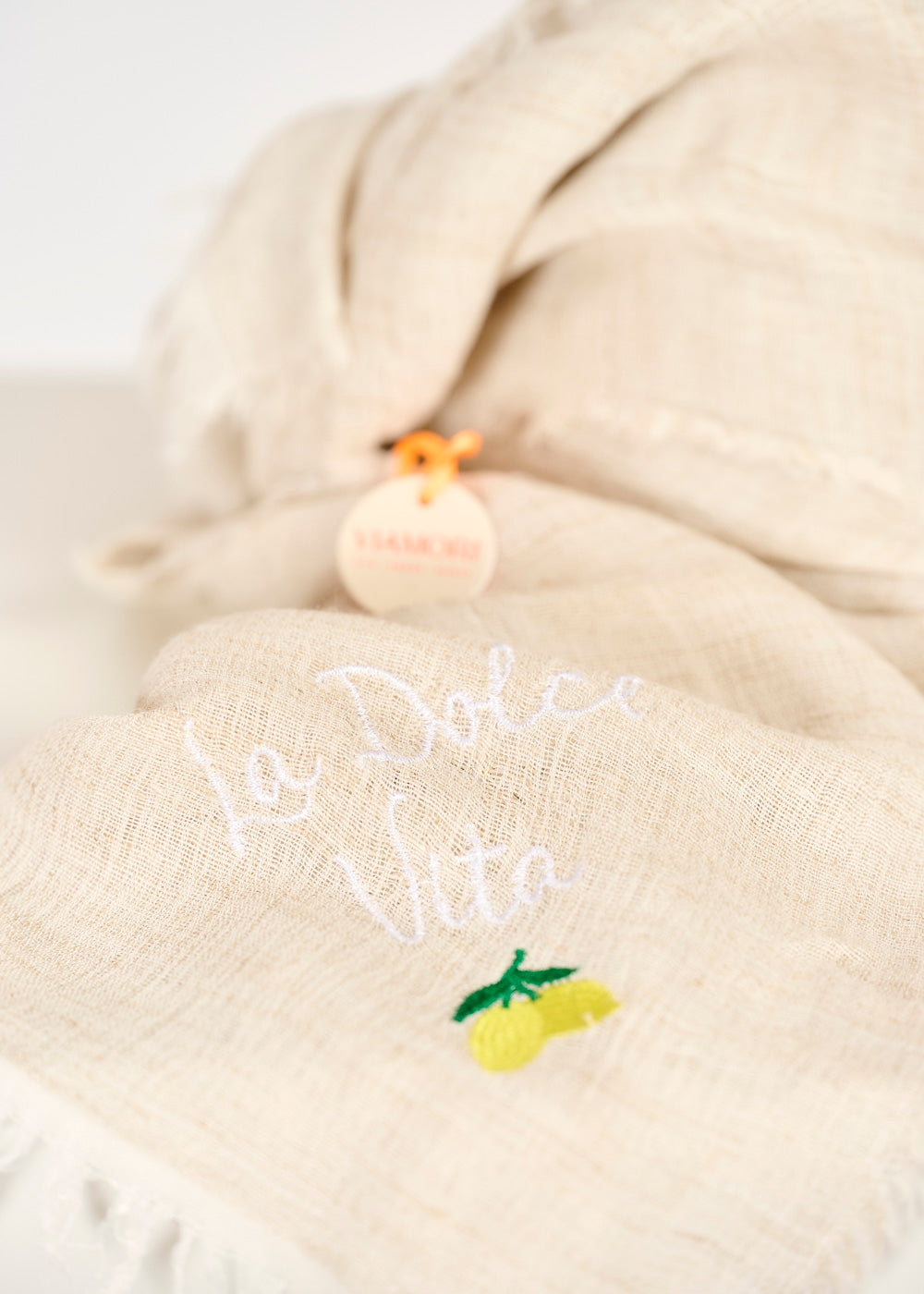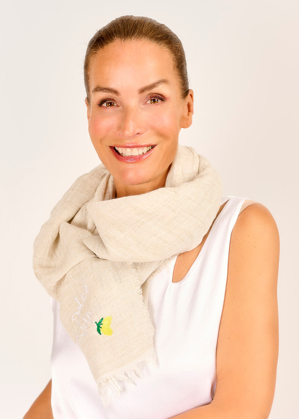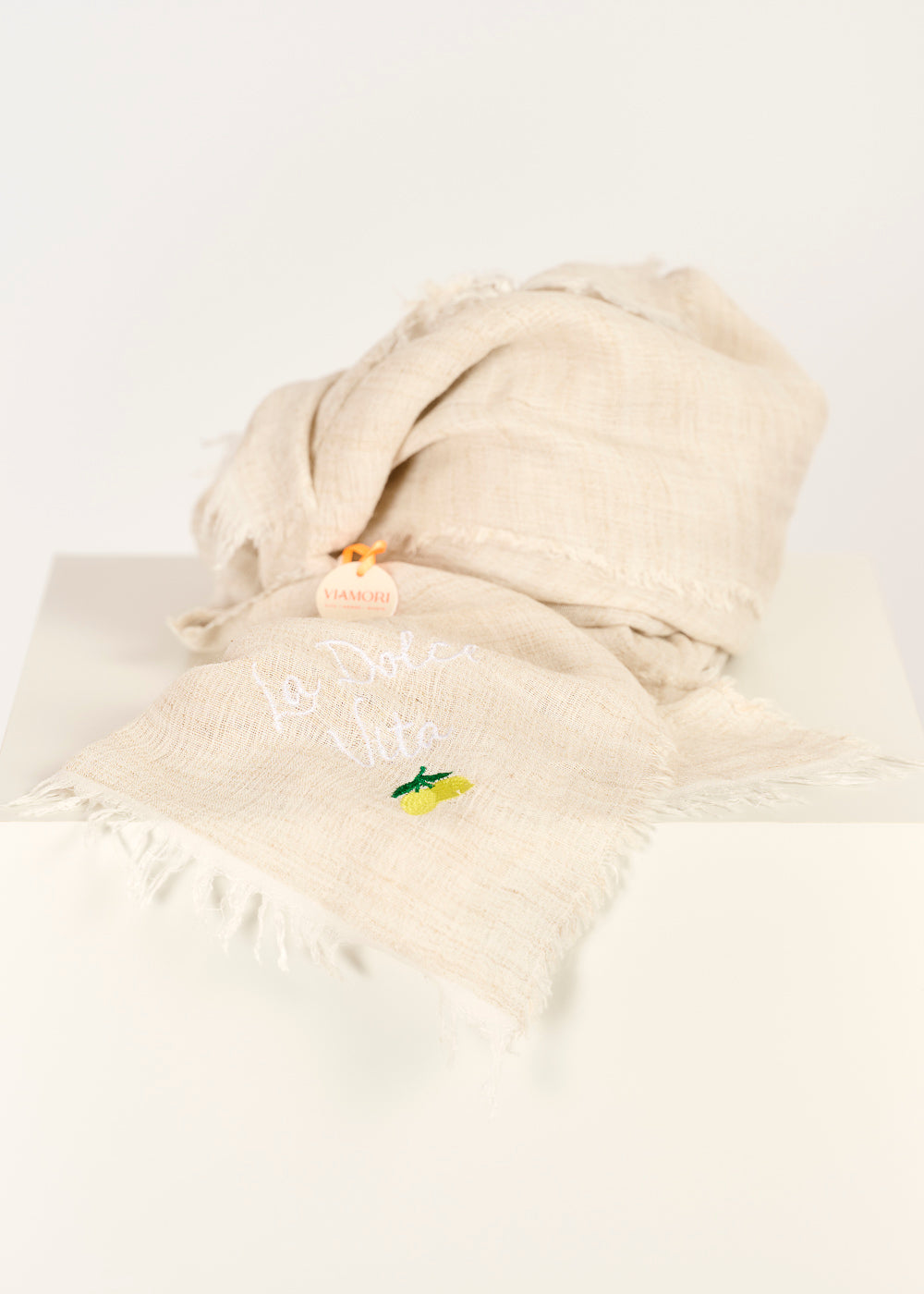 Das leichte Tuch von Viamori vereint sommerliche Leichtigkeit mit stilvoller Raffinesse. In zartem Beige mit weißer Stickerei „La dolce vita“ setzt es einen dezenten, eleganten Akzent. Die hochwertige Leinen-Modal-Mischung sorgt für ein angenehmes Tragegefühl – ideal für sonnige Tage.