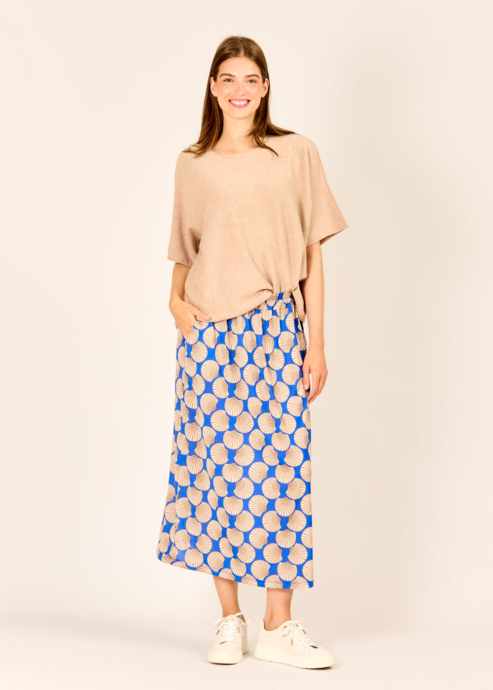 Dieser Rock mit seinem verspielten Muschelmuster in zartem Beige auf leuchtend blauem Hintergrund versprüht pure Sommerlaune. Aus 100% PES in hochwertiger Kofferware gefertigt, bleibt er selbst nach langen Reisen knitterfrei und jederzeit tragbereit. Ein leicht schwingendes Statement-Piece, das Komfort, Pflegeleichtigkeit und maritimen Chic perfekt vereint.