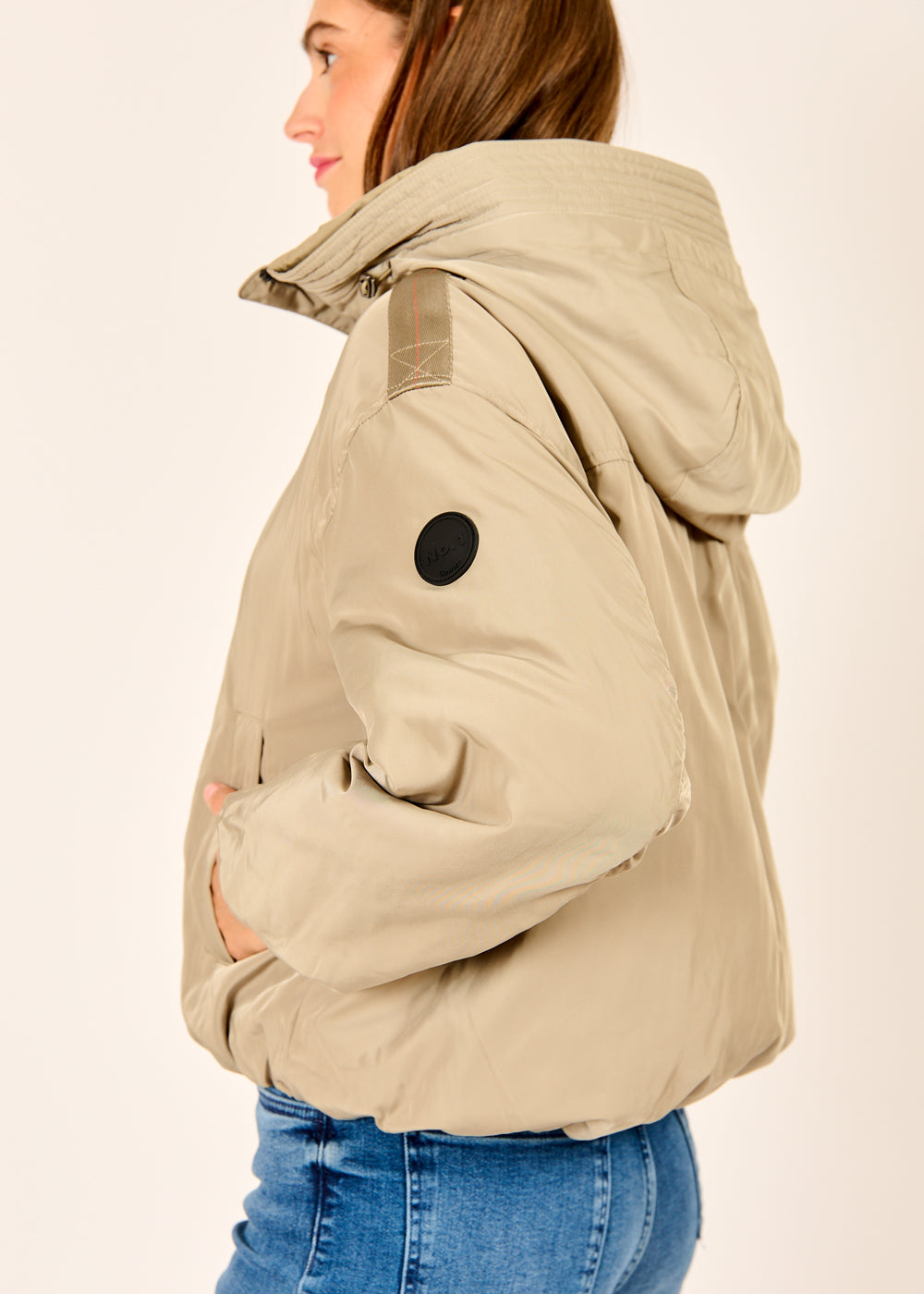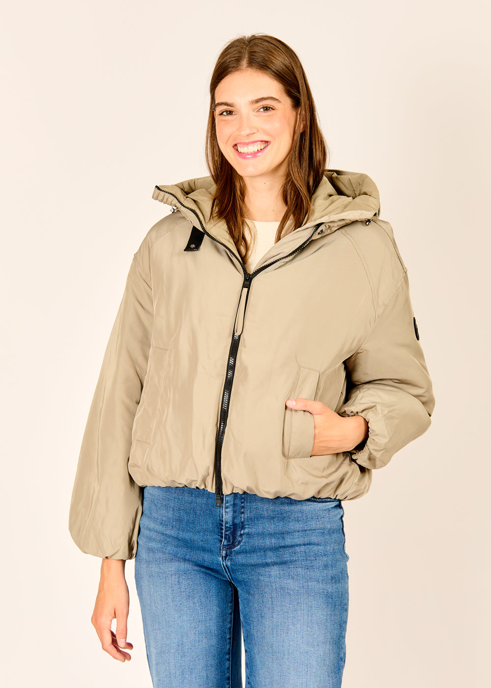 Mit ihrem leicht verkürzten Schnitt und den raffinierten Raffungen am Saum bringt diese Kurzjacke modische Frische in deinen Look. Das winddichte und wasserabweisende Material hält dich zuverlässig bei jedem Wetter geschützt. Eine leichte, vegane Wattierung schenkt angenehme Wärme, ohne das Outfit zu beschweren. Für zusätzliche Bewegungsfreiheit und Komfort sorgt der praktische Zweiwege-Reißverschluss.