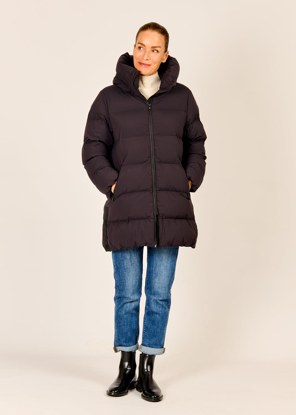 Die COMO No. 1 Stepplongjacke Sutton in elegantem Nero ist eine der wärmsten und dennoch leichtesten Begleiterinnen für die kommende Wintersaison. Ihre vegane, sehr leichte Wattierung hält dich zuverlässig warm, während die normale Passform und der über dem Gesäß endende Schnitt optimalen Tragekomfort bieten. Dank des Zweiwege-Reißverschlusses und der seitlichen Druckknopfleisten lässt sich die Jacke individuell anpassen, was auch beim Fahrradfahren für mehr Beinfreiheit sorgt. Die wattierte Kapuze und die schrägen Eingriffstaschen runden das Design dieses vielseitigen Winter-Essentials perfekt ab.