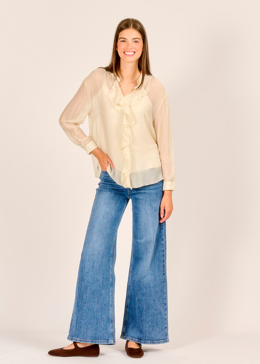 Diese feminine Bluse verzaubert mit zarten Rüschen, die das Dekolleté stilvoll betonen und dem Look eine romantische Leichtigkeit verleihen. Das fließende Material umspielt die Figur und sorgt für eine elegante Silhouette, die sowohl im Büro als auch bei festlichen Anlässen überzeugt. Durch ihr dezentes Design ist die Bluse vielseitig kombinierbar und wird zum absoluten Lieblingsteil in Ihrer Garderobe. Ein unverzichtbares Basic, das Sie im Handumdrehen in eine stilvolle Fashionista verwandelt.