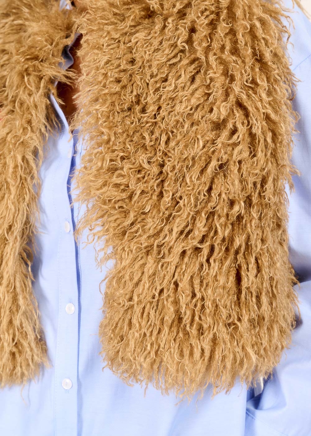 Bringe einen Hauch von luxuriösem Boho-Chic in deinen Kleiderschrank mit dieser Fake Fur Weste in warmem Caramello. Das lange, zottelige Kunstfell verleiht deinem Look eine aufregende Textur und hält dich kuschelig warm. Sie ist das perfekte Statement-Piece, um jedes schlichte Oberteil, wie etwa eine klassische Bluse, sofort aufzuwerten. Mit dieser Weste verleihst du deinem Outfit im Handumdrehen einen coolen und entspannten Vibe.