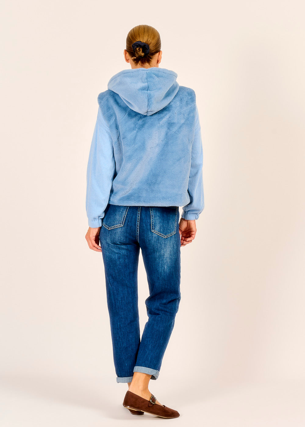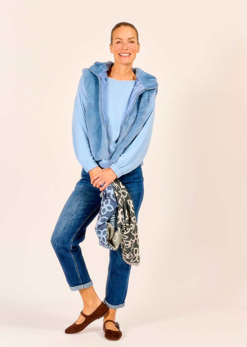 Celestefarbenes Kunstfell umhüllt Sie wie ein sanfter Hauch Luxus – weich, elegant und unwiderstehlich gemütlich. Mit Kapuze und klarer Linie ist sie die stilvolle Alternative zum Blazer, die drinnen wie draußen gleichermaßen überzeugt. Ein vielseitiges Statement-Piece, das jedem Outfit sofort Wärme und Raffinesse verleiht.