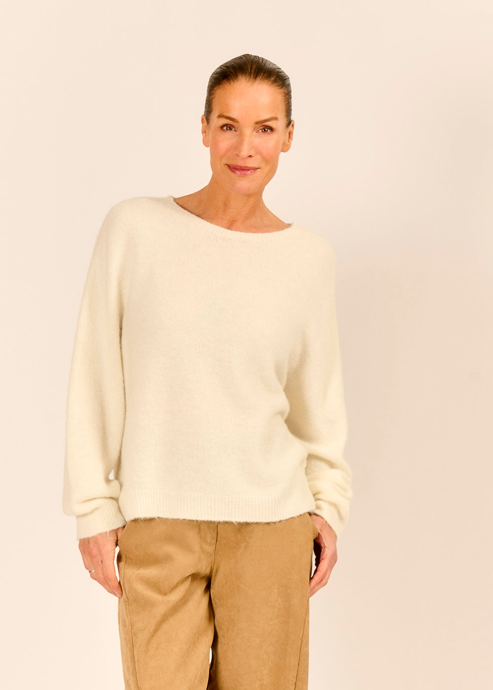 Unser beliebter Wohlfühlpullover mit alpakaweicher Haptik umhüllt dich mit Leichtigkeit. Ob lässig zu Jeans oder stilvoll zur Pantalone getragen – dieser Pullover in der Farbe Panna passt sich mühelos an. Ein zeitloses Lieblingsstück für alle, die den leisen und hochwertigen Look lieben.